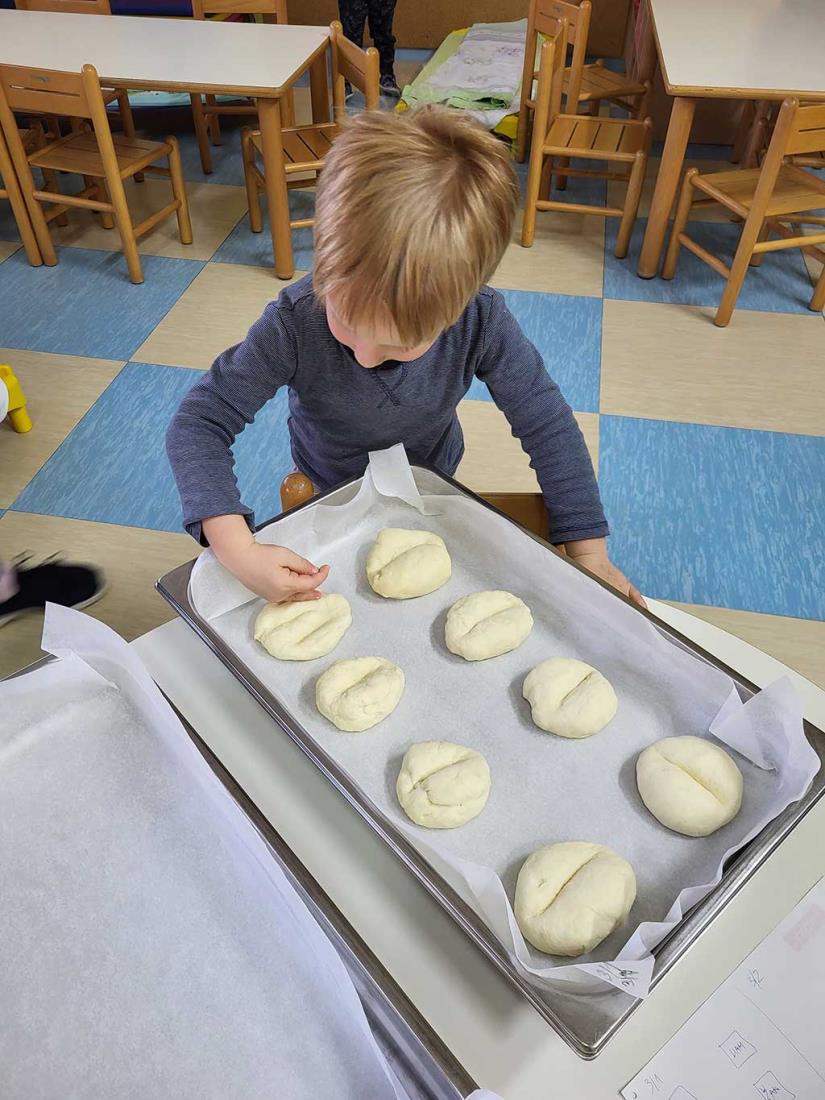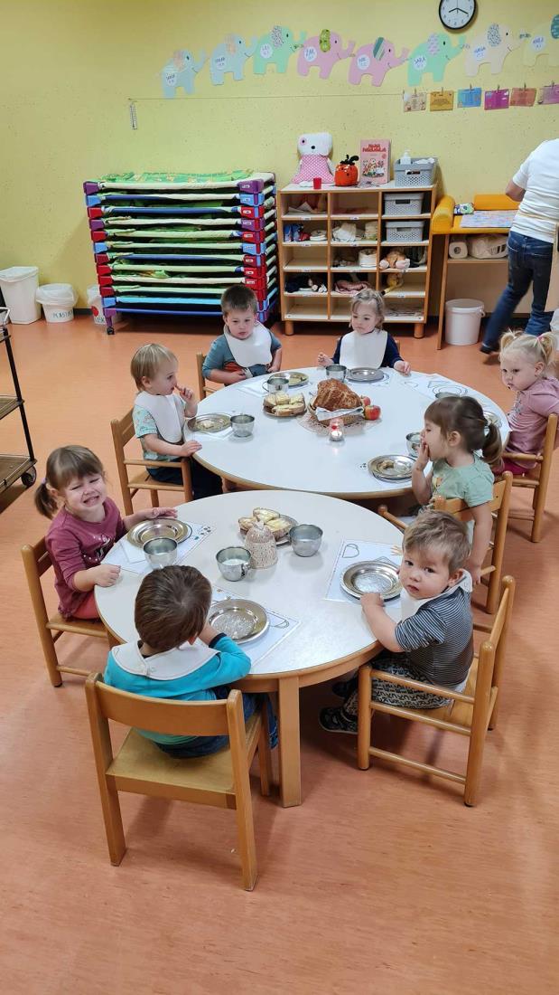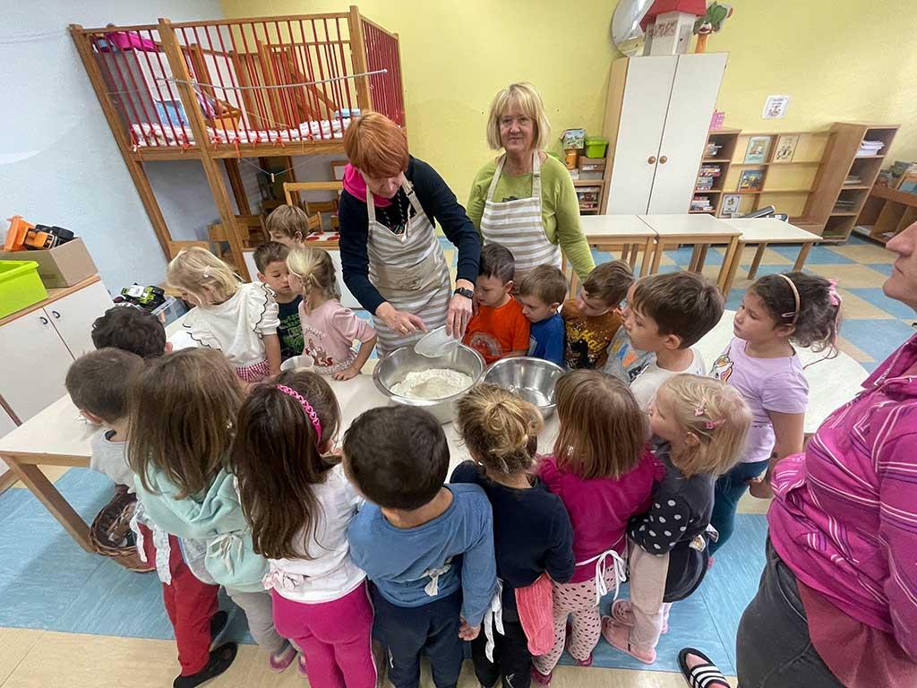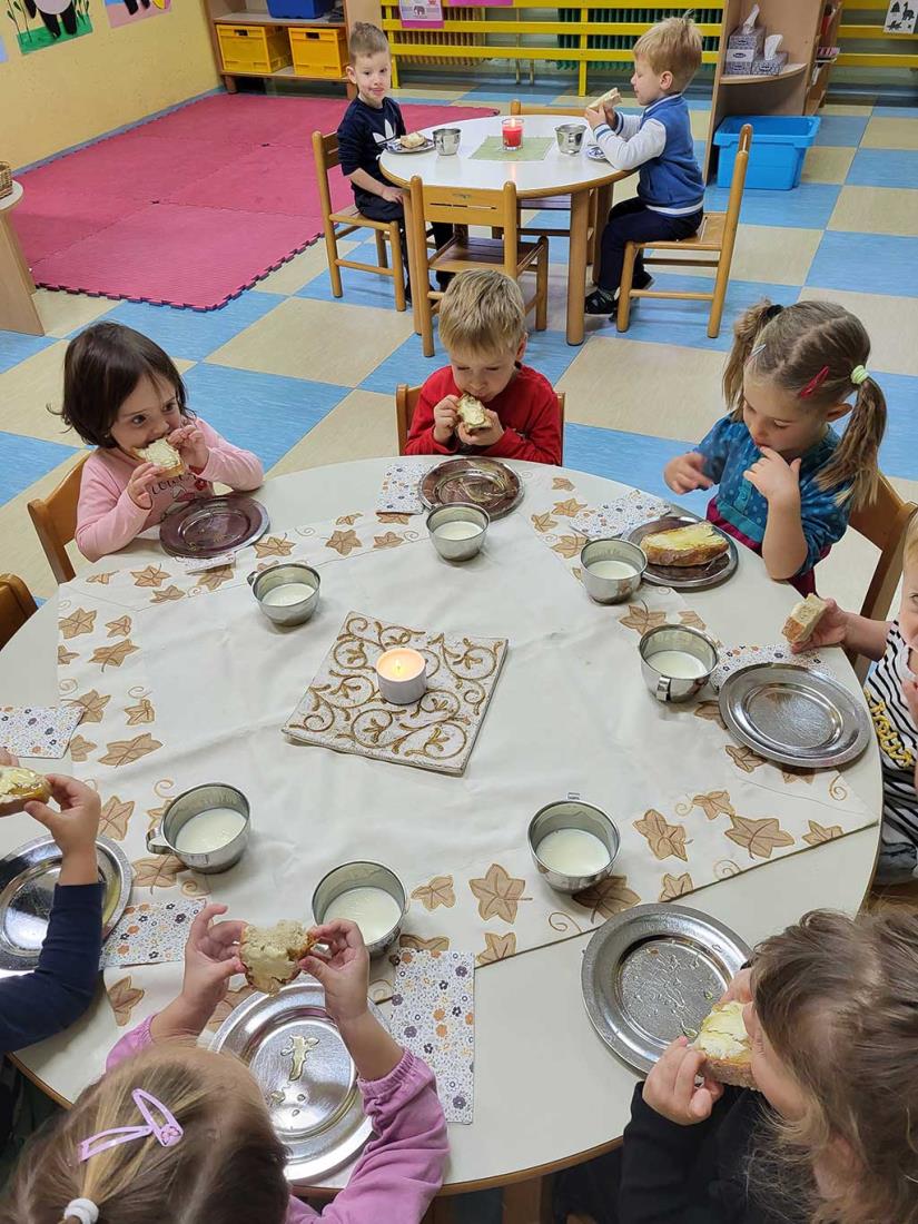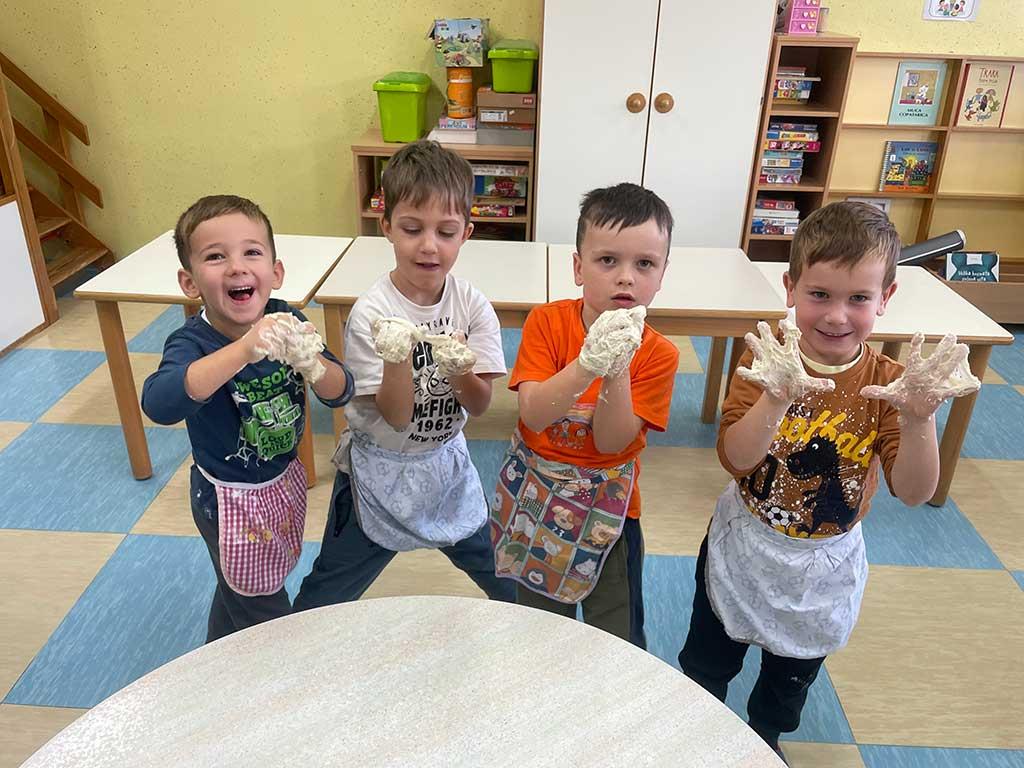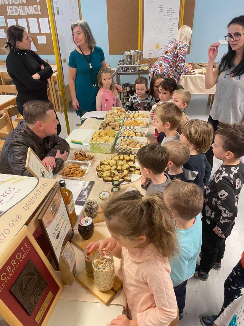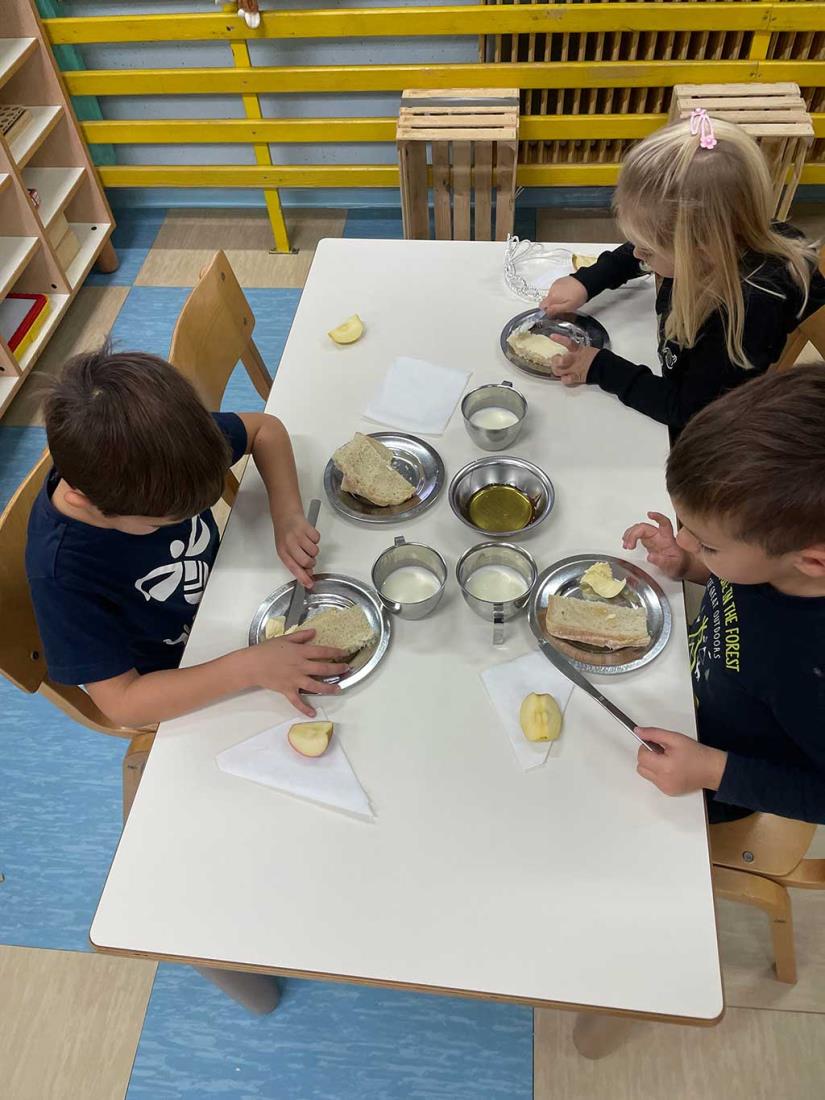 Skozi teden smo se pogovarjali o kruhu, spoznavali kako nastane, ter na vrtčevski razstavi v garderobi tipali in primerjali različne moke ter žita. V četrtek pa je po vrtcu zadišalo – po skupinah smo zamesili in spekli svoj kruh. Na pomoč so nam priskočili starši (v 1. oddelku) in gospe Društva podeželskih žena Braslovče (v 5. oddelku), za kar se jim zahvaljujemo. Tradicionalni zajtrk ima velik pomen na lokalnih pridelanih živilih. V ta namen so se v jedilnici šole predstavili lokalni ponudniki kruha – pek in mlinar. V petek pa smo si s pogrinjki in domačim kruhom, v sproščenem vzdušju postregli tradicionalni slovenski zajtrk – kruh, maslo, med, mleko ter jabolka.
