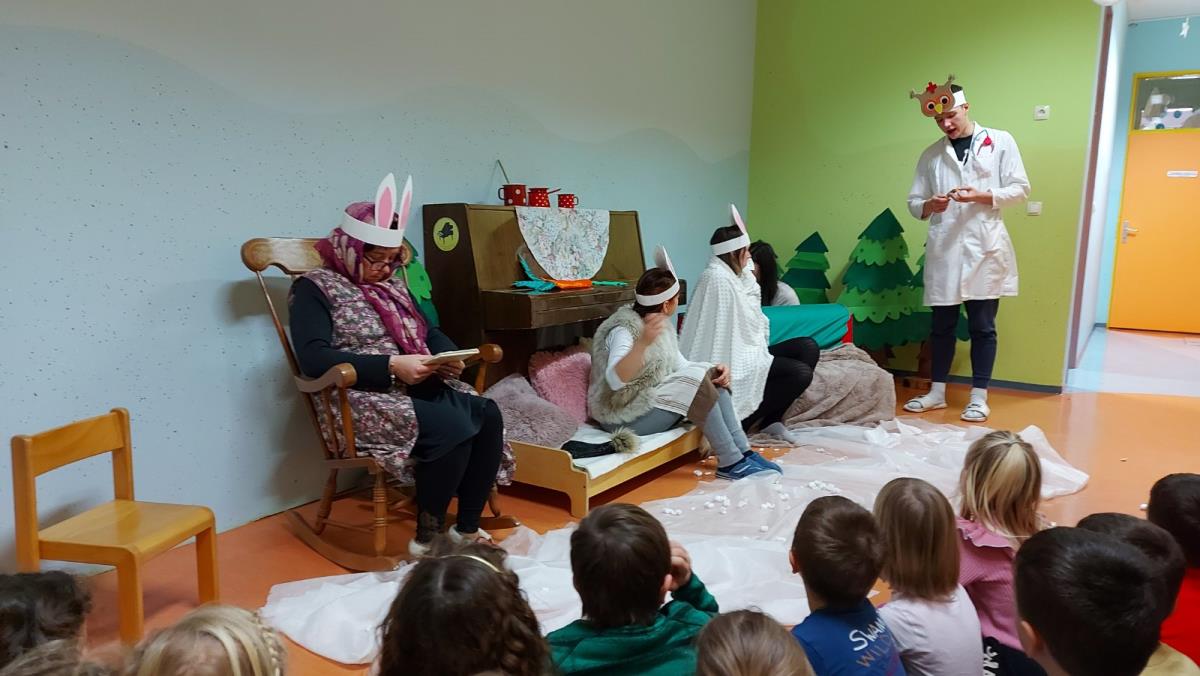 V mesecu januarju smo se v vrtcu pogovarjali o zimi, primernih zimskih oblačilih, v 4. oddelku so spoznavali življenje na severnem in južnem tečaju, v 2. in 3. oddelku pa smo še nekaj besed namenili osebni higieni in umivanju rok. Skozi slikanico »Ne liži te knjige!« smo spoznali virus Mimi, ki nam ponagaja pri zdravju. Ni pa Mimi edina ki nas spravi v posteljo. Tu je še škratek Prehladek s katerim res ne želimo imeti opravka. Zato smo v skladu s tematskim sklopom, ob koncu meseca, strokovne delavka vrtca pripravile dramatizacijo »Škratek Prehladek«. Predstavo so si otroci ogledali v petek, 26.1., in v njej zelo uživali.